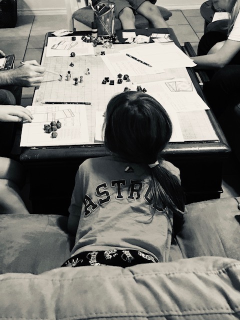 When we sit around the dining room table, the coffee table or outside on the patio, we face one another and engage. Armed with a pencil, paper and imagination, you are part of the storytelling process in the game. The Dungeon Master, who operates as the storyteller, referee and other characters in the game, sets the fictional stage where each of the players around the table build upon the ideas infusing their own created characters as heroes of the tale. Each game lasts from 2-4 hours with breaks and with about 3-6 players, the most interesting and exciting adventures can unfold!